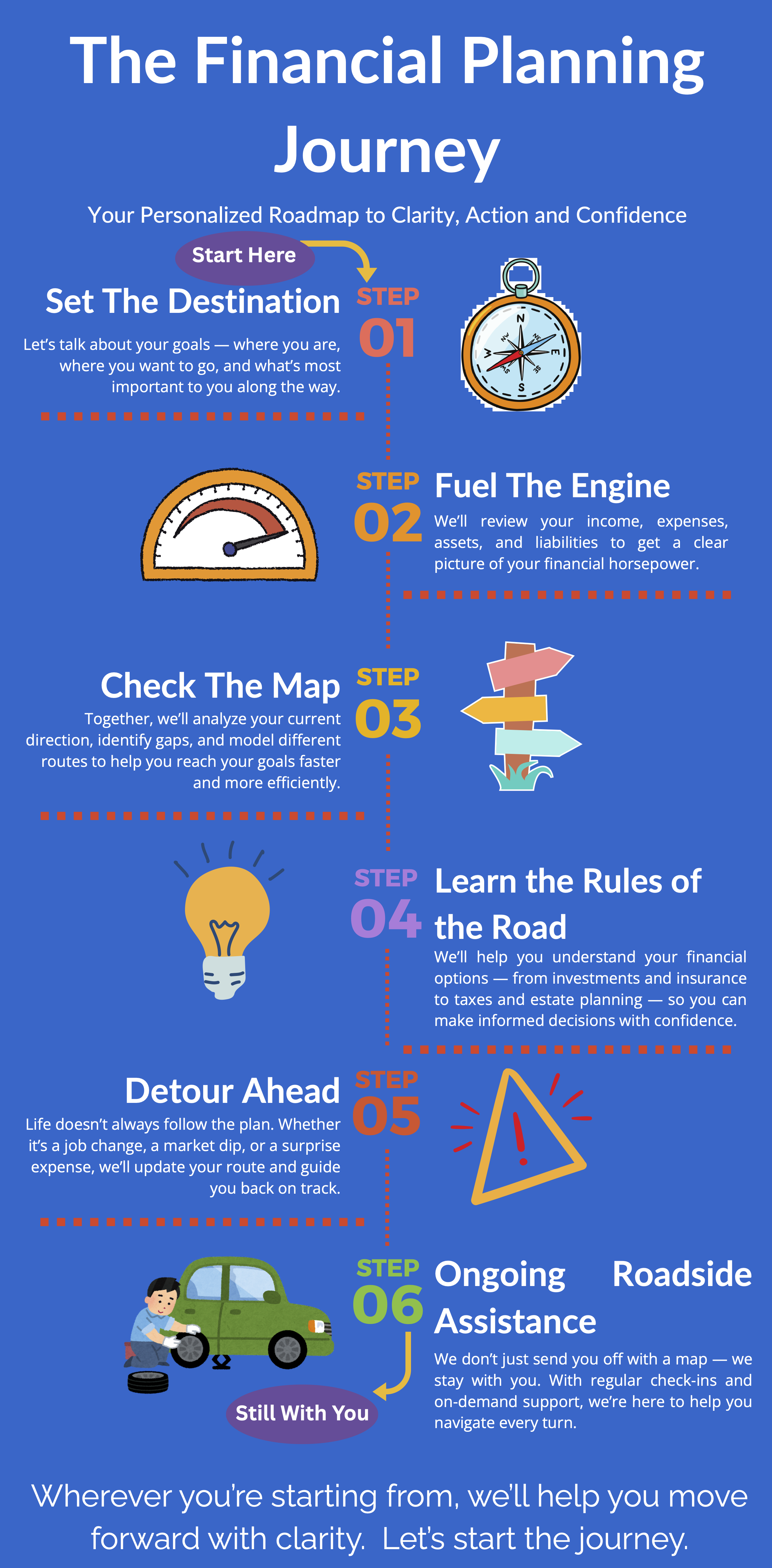 Our process is designed to meet you where you are — whether you’re just starting out, juggling career and family, or preparing for retirement. We’ll help you create a plan that reflects your goals, adapts with your life, and gives you the clarity to move forward with confidence.